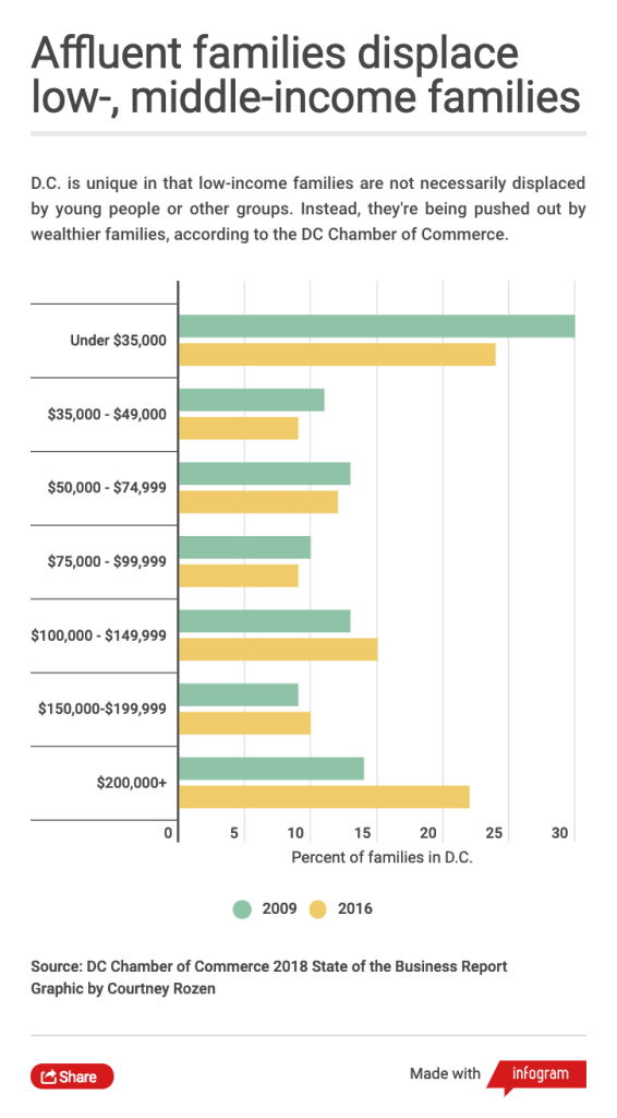 The Chamber defines low-income families as those who earn less than $35,000 per year. They define middle-income as those who earn less than $100,000 per year, respectively. Together, low- and middle-income families now make up 52% of all families in D.C., compared to 64% 10 years ago, according to a report released by the Chamber in 2018. 22% of D.C. families in 2018 earned more than $200,000 per year. He sees this displacement as a priority for D.C.’s business community, who relies on workers of different income levels to keep companies operating.